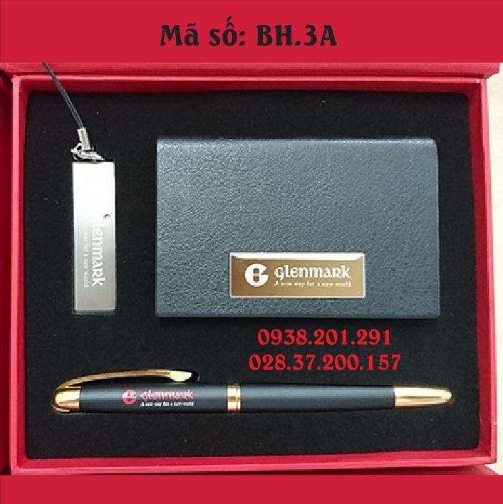 Bộ quà tặng mã số BH.3A bao gồm 1 hộp namecard màu đen, khắc logo Glenmark, 1 usb kim loại màu bạc xinh xắn, một cây bút kim loại màu đen mờ, cài vàng có logo công ty rất đẹp và ấn tượng