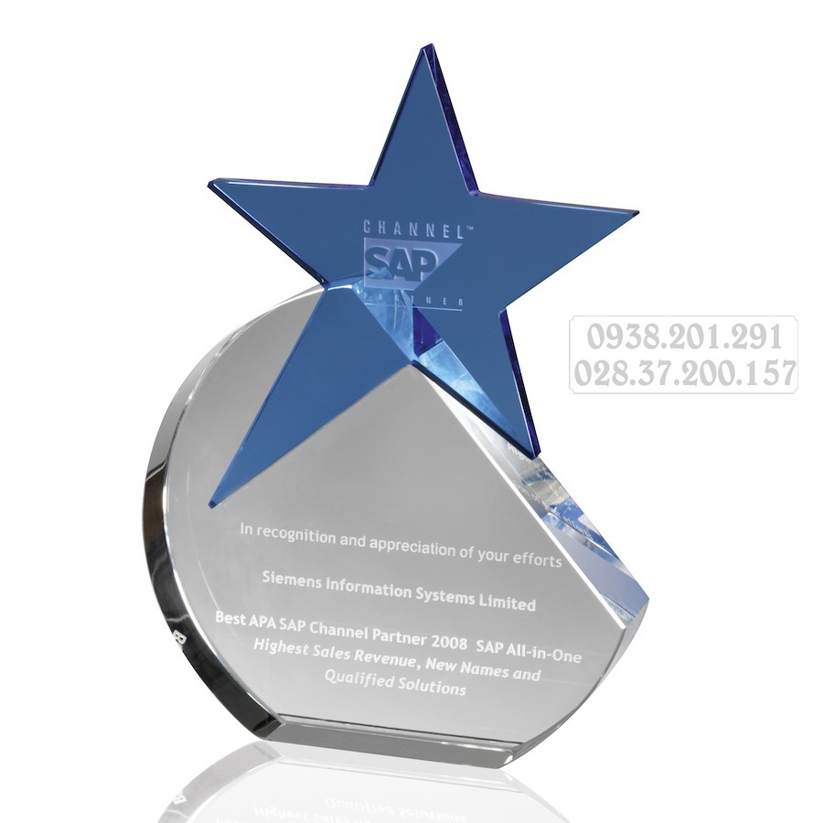 Kỷ niệm chương hình ngôi sao xanh dương trên đế hình trụ trong suốt, nội dung: