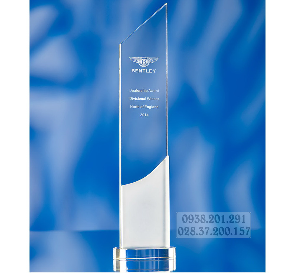 Kỷ niệm chương thủy tinh pha lê hình trụ đứng, phối màu trắng bạc với màu trong suốt của Bentley