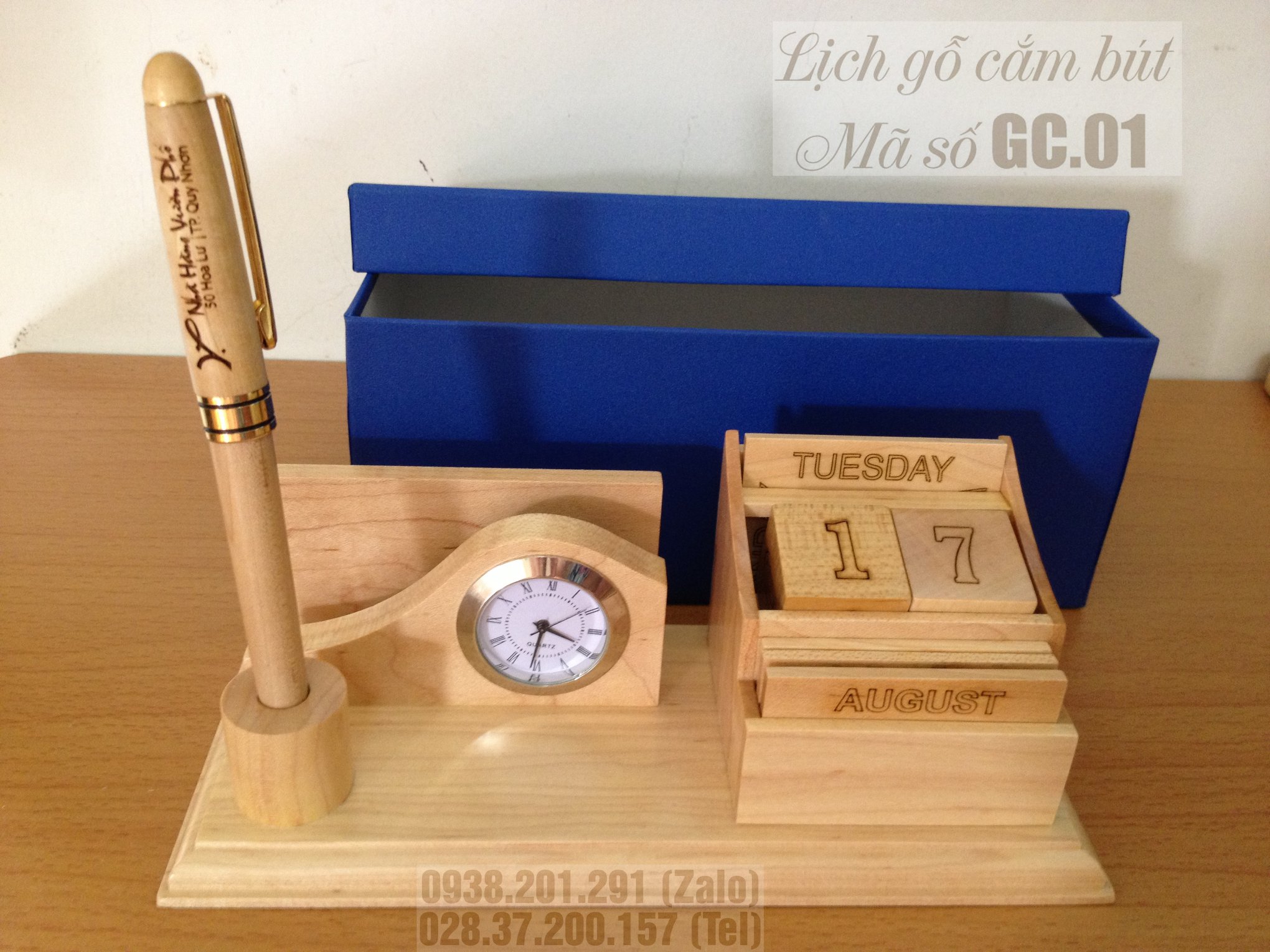 Bộ sản phẩm lịch gỗ có chỗ cắm bút và gài namecard để bàn, khắc tên và lời đề tặng theo yêu cầu, là sản phẩm dùng làm quà tặng sinh nhật, quà tặng khách hàng, đối tác rất đẹp, độc đáo và ý nghĩa