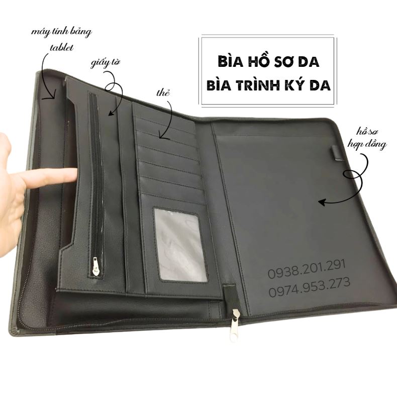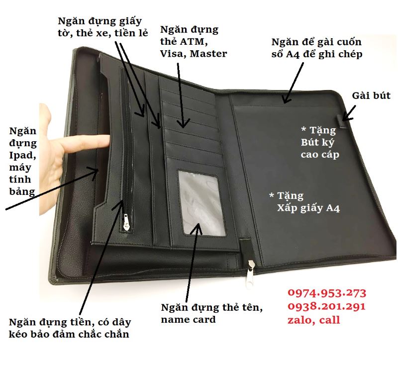 Kế đến là các ngăn nhỏ đựng namecard và giấy tờ, vé xe, bút viết...rất tiện lợi cho một nhân viên văn phòng khi đi họp hành, hội nghị, hội thảo, học tập. Bìa có dây khóa kéo để đóng lại, có thể xách đi khắp nơi mà không sợ bị rơi rớt giấy tờ, đồ đạc