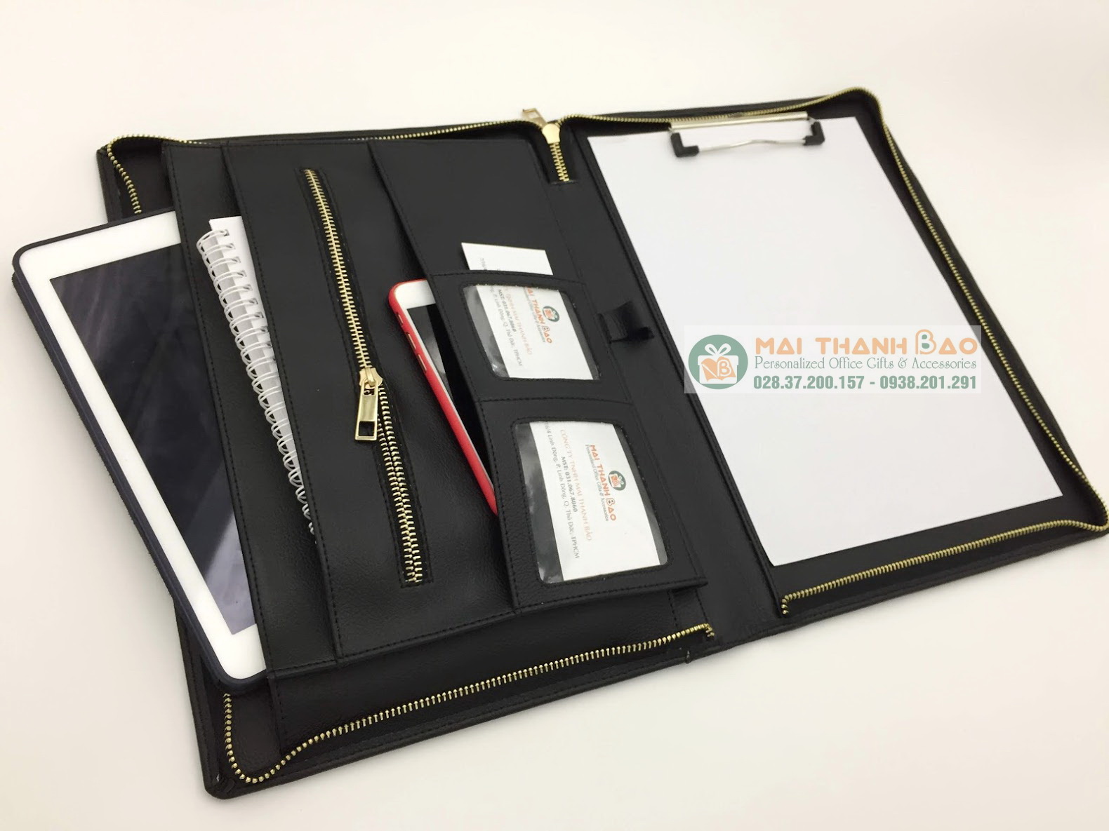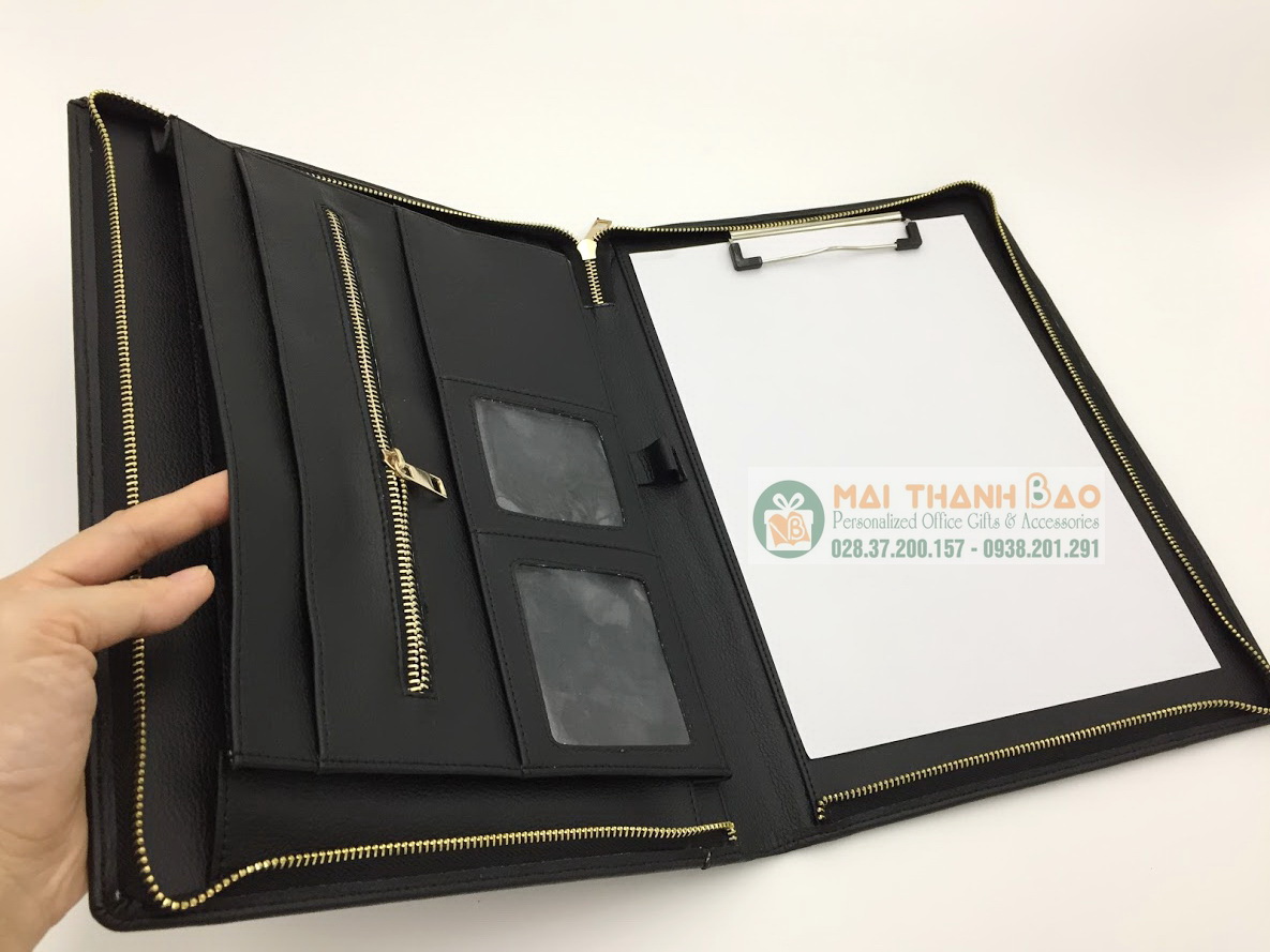 - Kế đến là các ngăn nhỏ đựng namecard và giấy tờ, vé xe, bút viết...rất tiện lợi cho một nhân viên văn phòng khi đi họp hành, hội nghị, hội thảo, học tập. Bìa có dây khóa kéo để đóng lại, có thể xách đi khắp nơi mà không sợ bị rơi rớt giấy tờ, đồ đạc,...