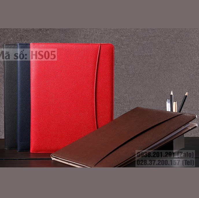 Bìa hồ sơ simili giả da đẹp, có nhiều màu sắc như nâu, đỏ, xanh dương, đen... và có thể đặt hàng theo yêu cầu, với logo của quý khách