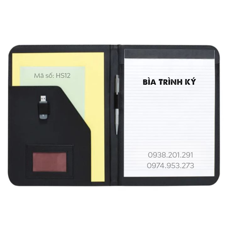 Bìa hồ sơ màu đen A4, in logo theo yêu cầu, có ngăn đựng namecard, đựng thẻ và đựng sổ ghi chú, gài bút
