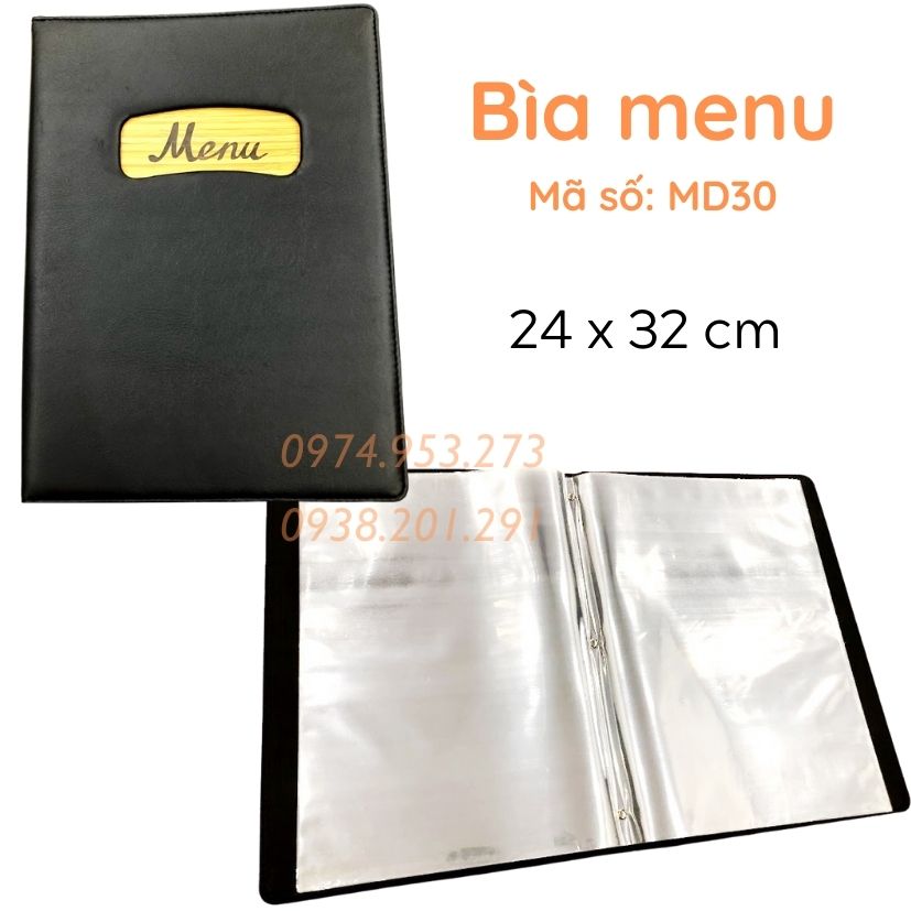 Bìa menu da simili loại dài, có các lá nhựa trong ở bên trong để nhét tờ menu, có thể thay thế khi đổi menu Kích thước 23 x 32 cm Mã số MD31